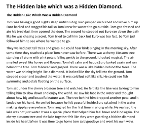 Later that day Chloe was exploring her neighbourhood when she noticed a river. It was frozen and it looked abandoned. There was a sign that had fallen down. Chloe went to pick it up. The sign looked a thousand years old. It read: Lake of Bert Hampton. Chloe went home and urged her parents to come. “ Come come!” Chloe called. Her parents came with her. “Ahh now I remember that river from when I was little. I used to play there. Now people have forgotten about it’’ her dad said.