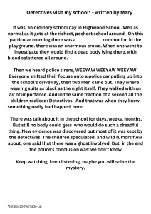 Then we heard police sirens, WEEYAW WEEYAW WEEYAW. Everyone shifted their focuse onto a police car pulling up into the school’s driveway, then two men came out. They where wearing suits as black as the night itself. They walked with an air of importance. And in the same fraction of a second all the children realised: Detectives. And that was when they knew, something really bad happed here.