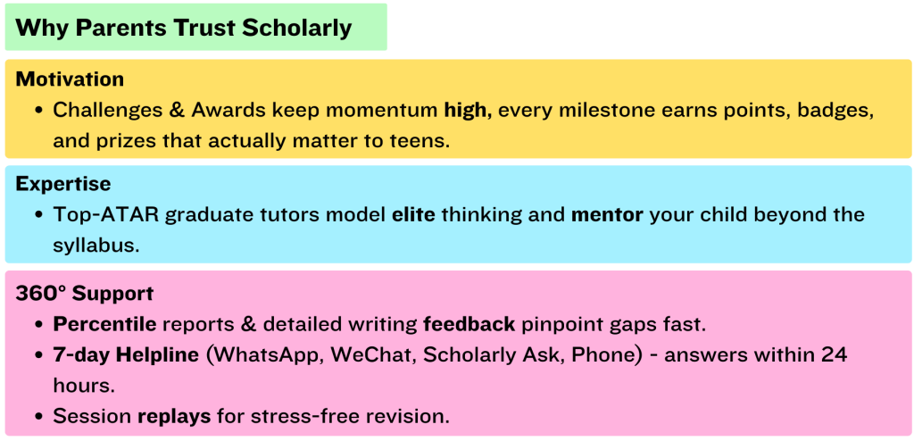 I have overcome diminishing OC English result of 40% to get into James Ruse with 100% in English through determination and hard work. The main challenge personally regarding the selective test was English and Writing which I overcame with lots of help from Scholarly and Steve. Getting full marks in English and 97% in Maths was mainly achieved from a large quantity of hard and challenging practice which made Selective English and Maths personally quite easy for me.