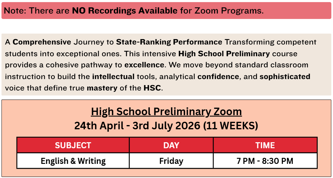 Advanced narrative techniques: unreliable narration, fragmentation, symbolic layering. Deconstructing HSC prompts and adapting a core narrative to any question. Building technique density and structural complexity. Crafting resonant endings that leave interpretive space.