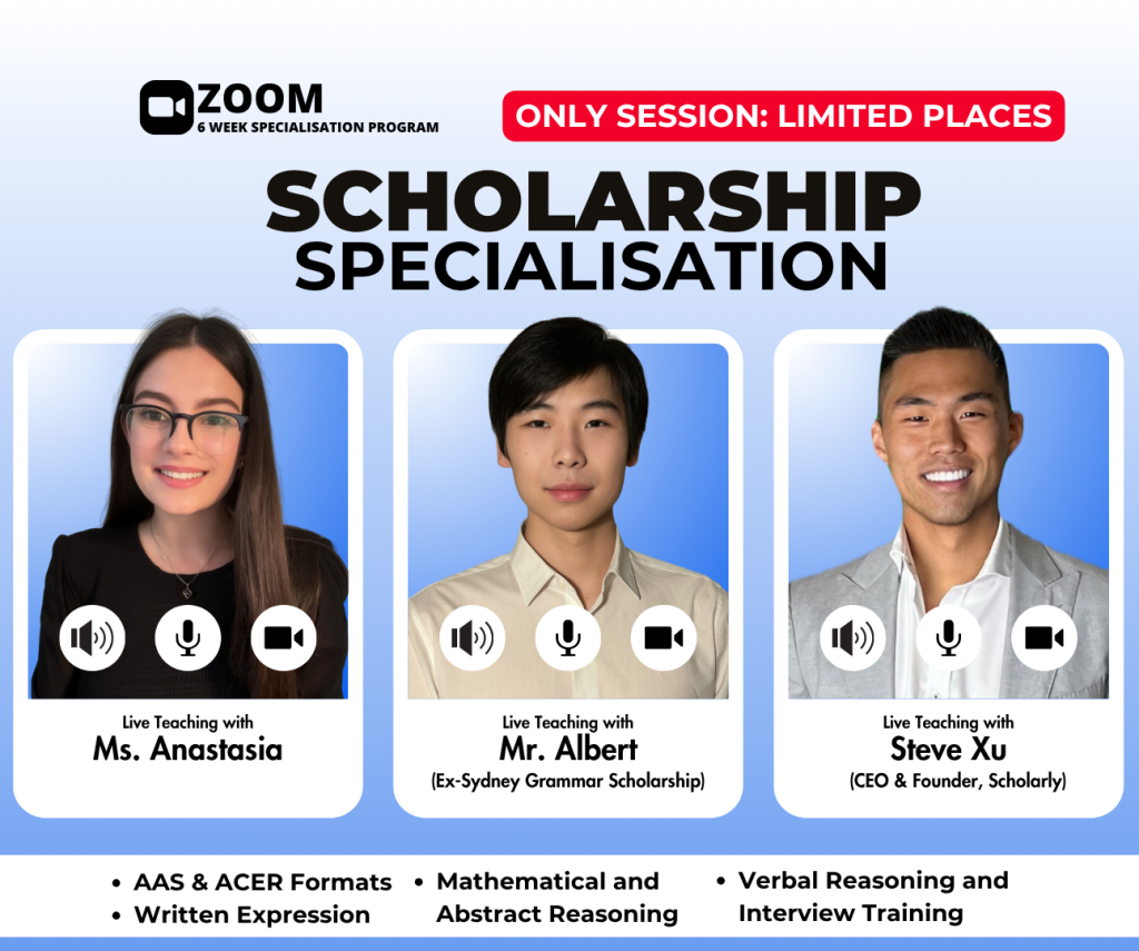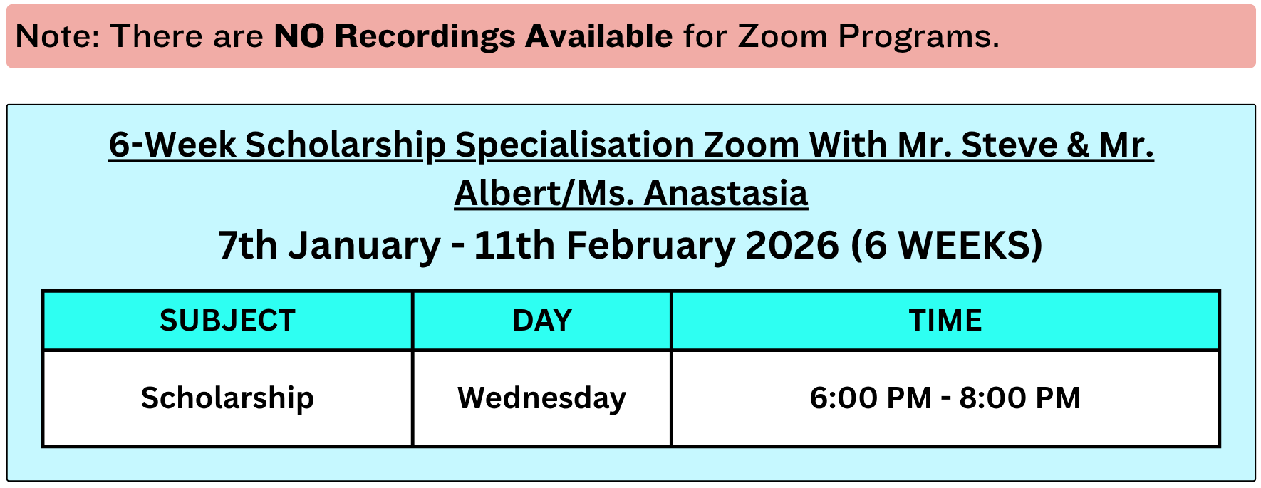 6-Week Scholarship Specialisation Zoom With Mr. Steve & Mr. Albert/Ms. Anastasia