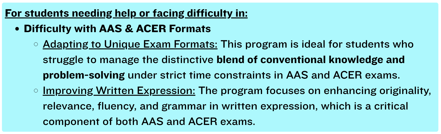 Join Mr. Steve & Mr. Albert/Ms. Anastasia in addressing the specific challenges Year 6 students face with AAS and ACER exam formats, question styles, and overall test preparation.