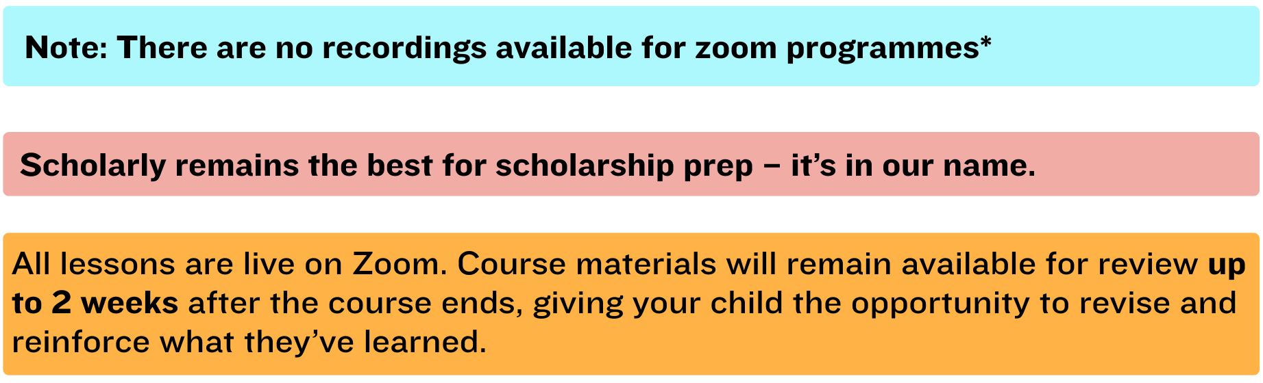 All lessons are live on Zoom. Course materials will remain available for review up to 2 weeks after the course ends, giving your child the opportunity to revise and reinforce what they’ve learned.