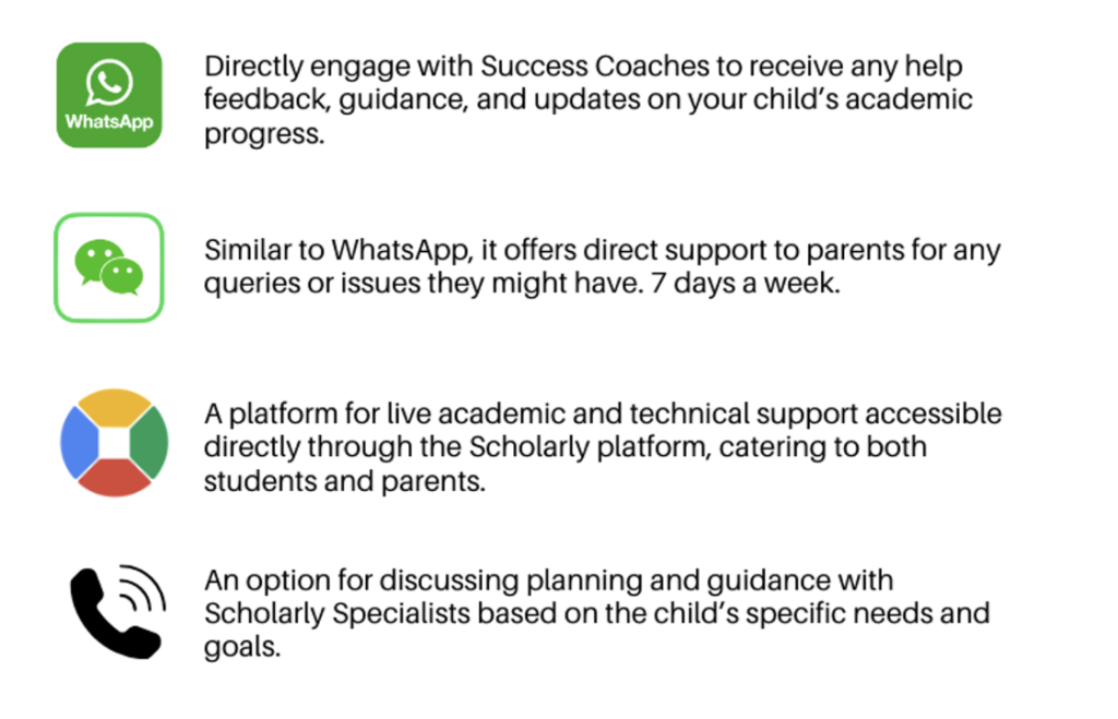 A platform for live academic and technical support accessible directly through the Scholarly platform, catering to both students and parents.
