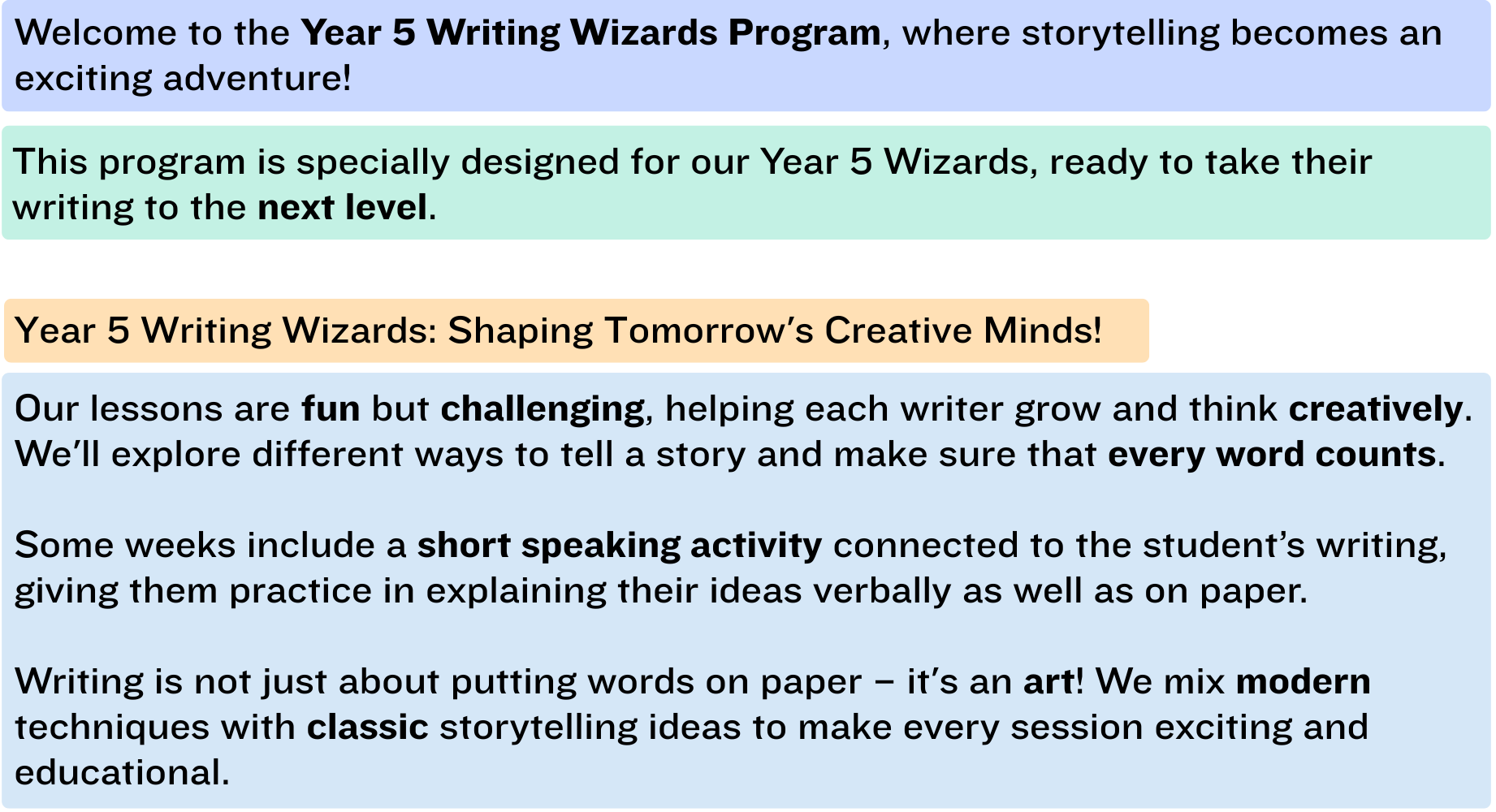 Does your child have a flair for words, yearning to express themselves through the power of writing? Our Writing Wizards course is the perfect magical gateway to unlock your child’s inner wordsmith! Designed for students in Year 5 , this course covers 12 levels of writing techniques, each building on the previous, to enhance writing skills. As students advance through the levels, they tackle more complex writing challenges, expanding their skills and exploring new genres. From creative storytelling to informative articles, our course prepares students to excel in various writing forms and adapt their skills to any writing task. But the magic doesn’t end there! Our Writing Wizards course fosters a supportive community of young writers, where students can share their work, receive constructive feedback, and learn from their peers. We believe in the power of collaboration and provide a platform for students to grow and thrive together.