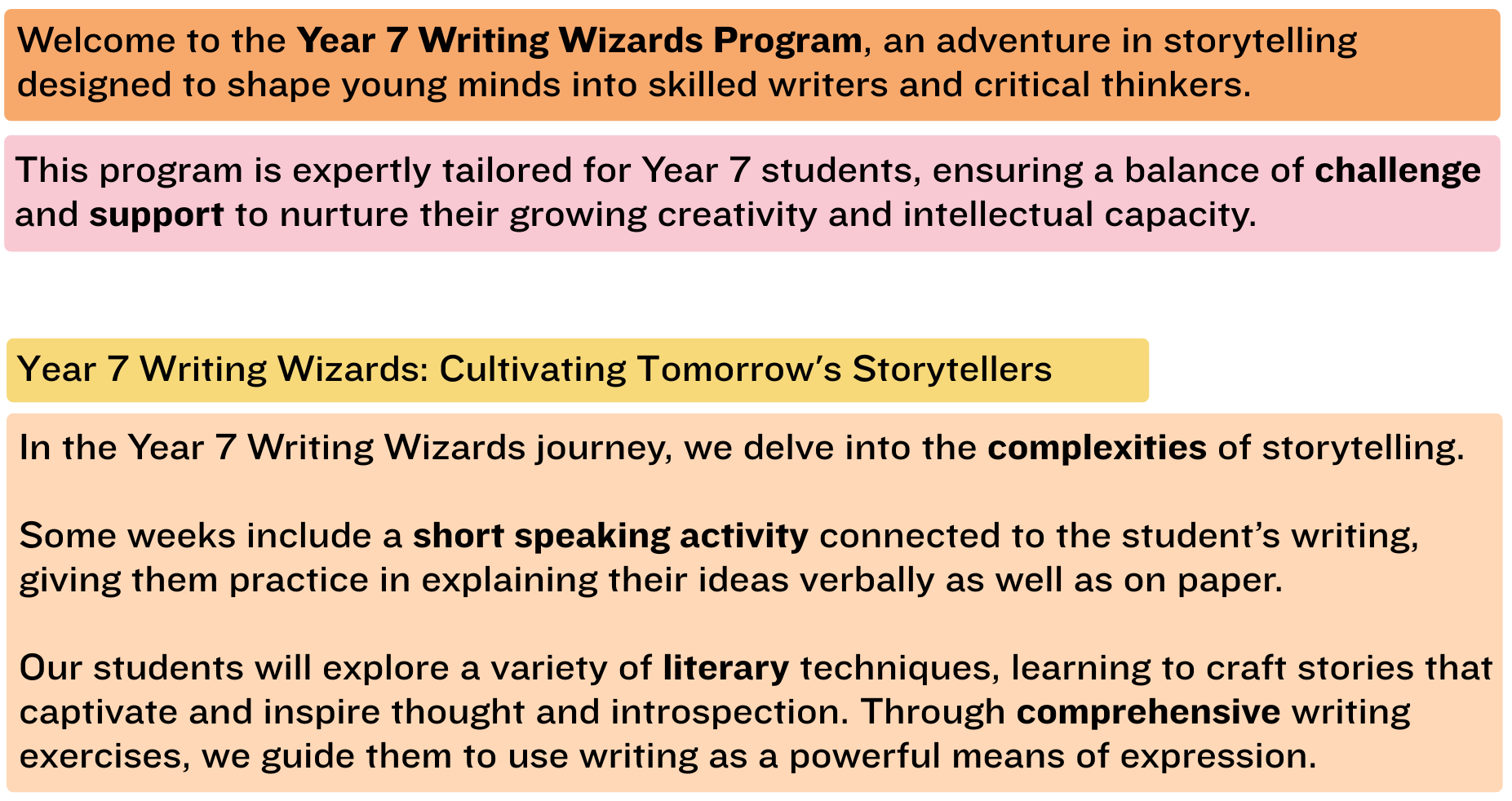 Designed for students in Year 7 , this course covers 12 levels of writing techniques, each building on the previous, to enhance writing skills.