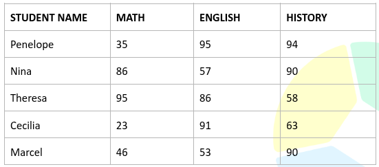 Five students were named the five highest scorers for the midterm exams. The average of their total scores for each subject will be the basis for their final score. The scores for each subject for the five students are shown in the table.