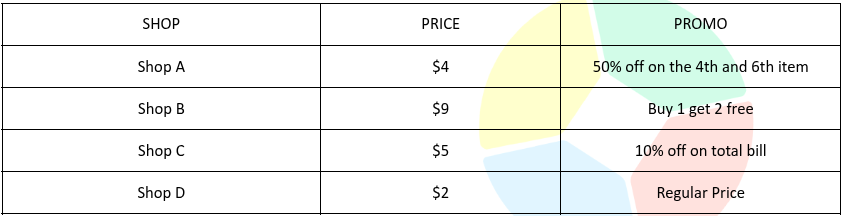Kyle owns a supermarket. Each week, he has a special offer on some of the products that he sells. He advertises these offers by comparing his prices to one of the other local shops. The comparison done weekly is based on the ingredients involved in making a certain dish.