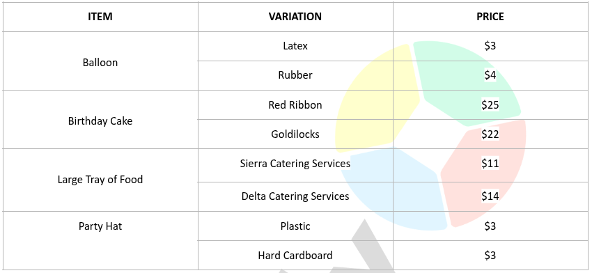 Shandee won first place in a singing contest, so her mom will give her a prize. She was given four lists, and she needed to choose only one from each list.