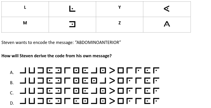 Nicole sent a message to Joseph in an encrypted code. She used pictures rather than letters. Joseph knows that the following symbols represent the word “BEAT.”