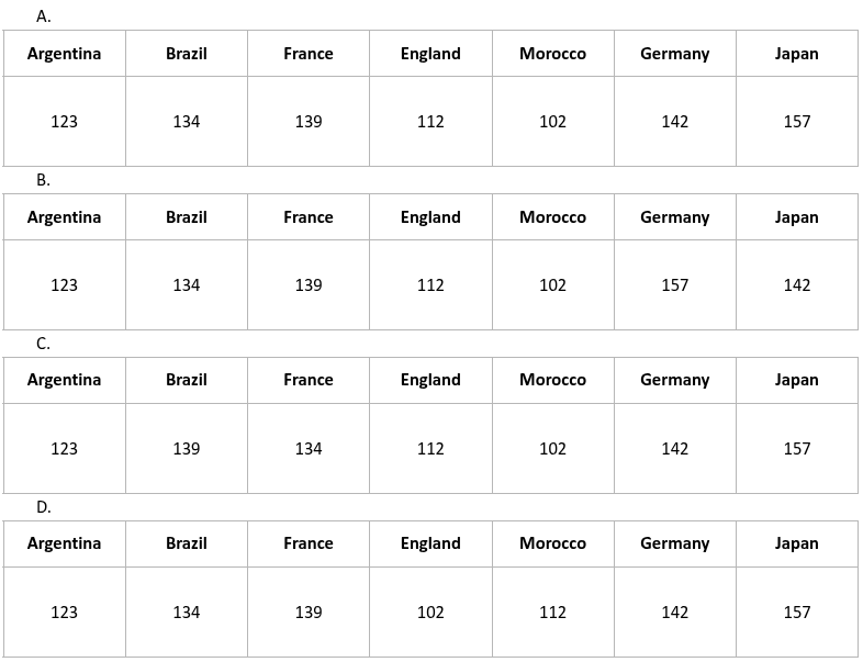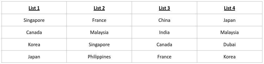 Brittanie is a consistent honour student which is why her mother wants to give her a reward. Brittanie said that she wants to travel to different countries during their term break. Her mother gave her four lists and she can only choose one country from each list.