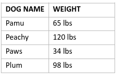 Elsa feeds her dogs according to their weights. The table below shows the weights of her dogs.
