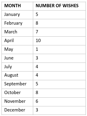 Aladdin was offered a lamp by a genie. The genie grants a different number of wishes per month. The table below shows the number of wishes each month.