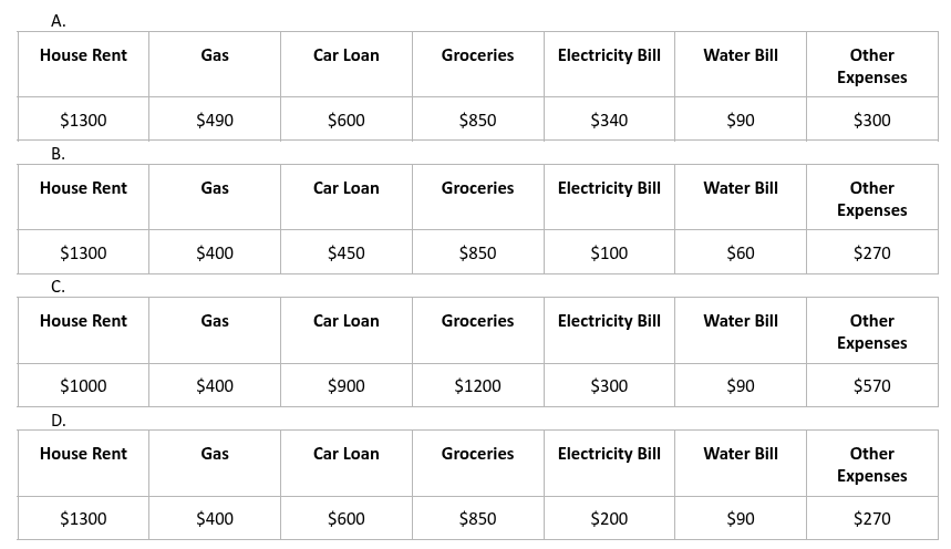 Which of the following data sets best matches the pie chart representation if the pink portion is represented by Other Expenses?