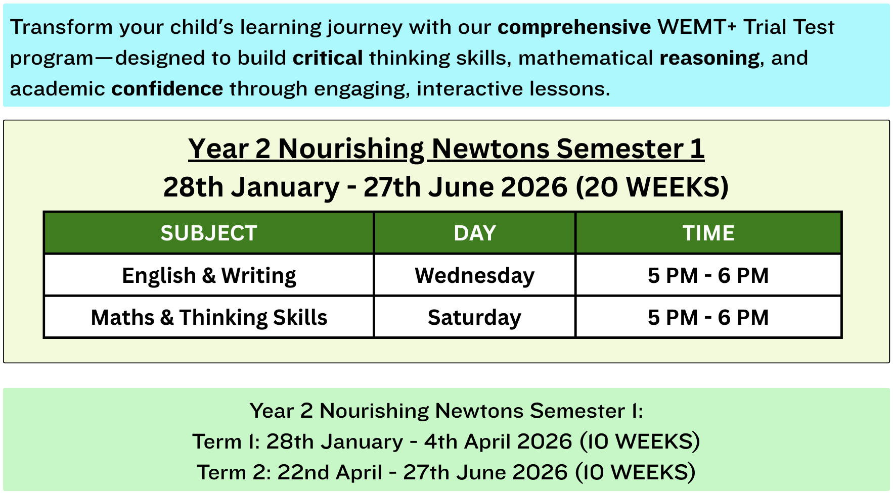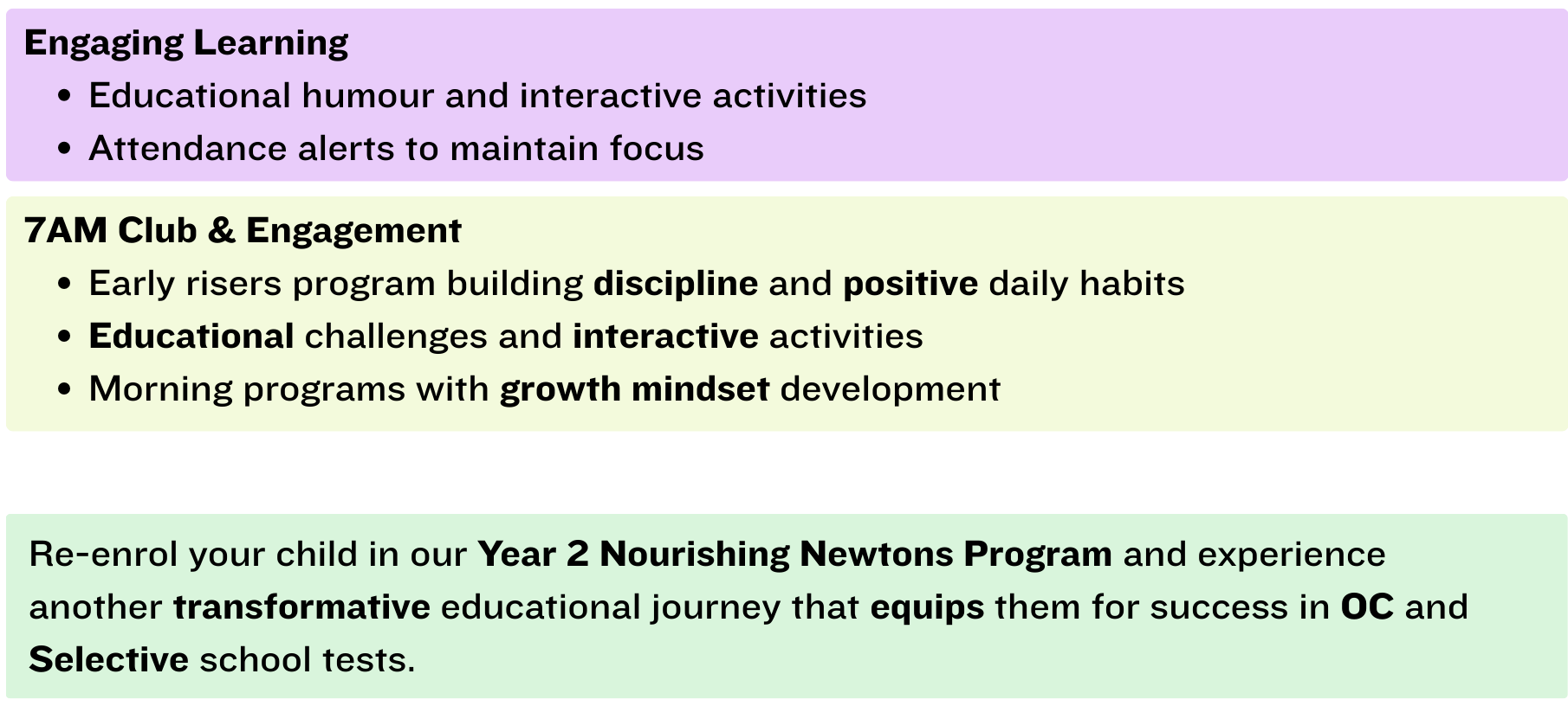 Enrol your child in our Year 2 Nourishing Newtons program and experience another transformative educational journey that equips them for success in OC and Selective school tests.