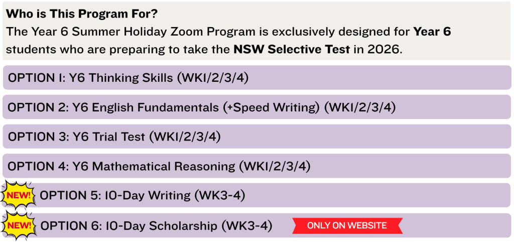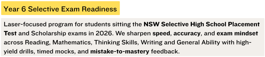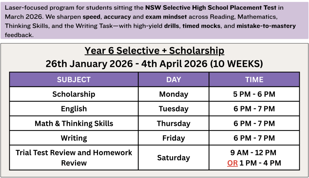 Laser-focused program for students sitting the NSW Selective High School Placement Test in March 2026.