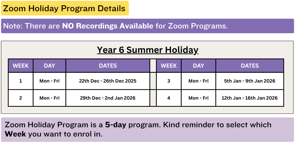 All lessons are live and will be recorded for review up to 2 weeks after the course ends. This gives your child the opportunity to revise and reinforce what they’ve learned.