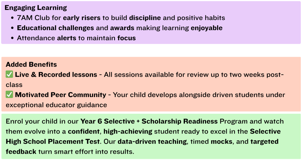 Enrol your child in our Year 6 Selective + Scholarship program and let’s aim to make learning a joyous journey!