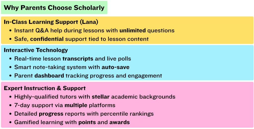 A platform for live academic and technical support accessible directly through the Scholarly platform, catering to both students and parents.