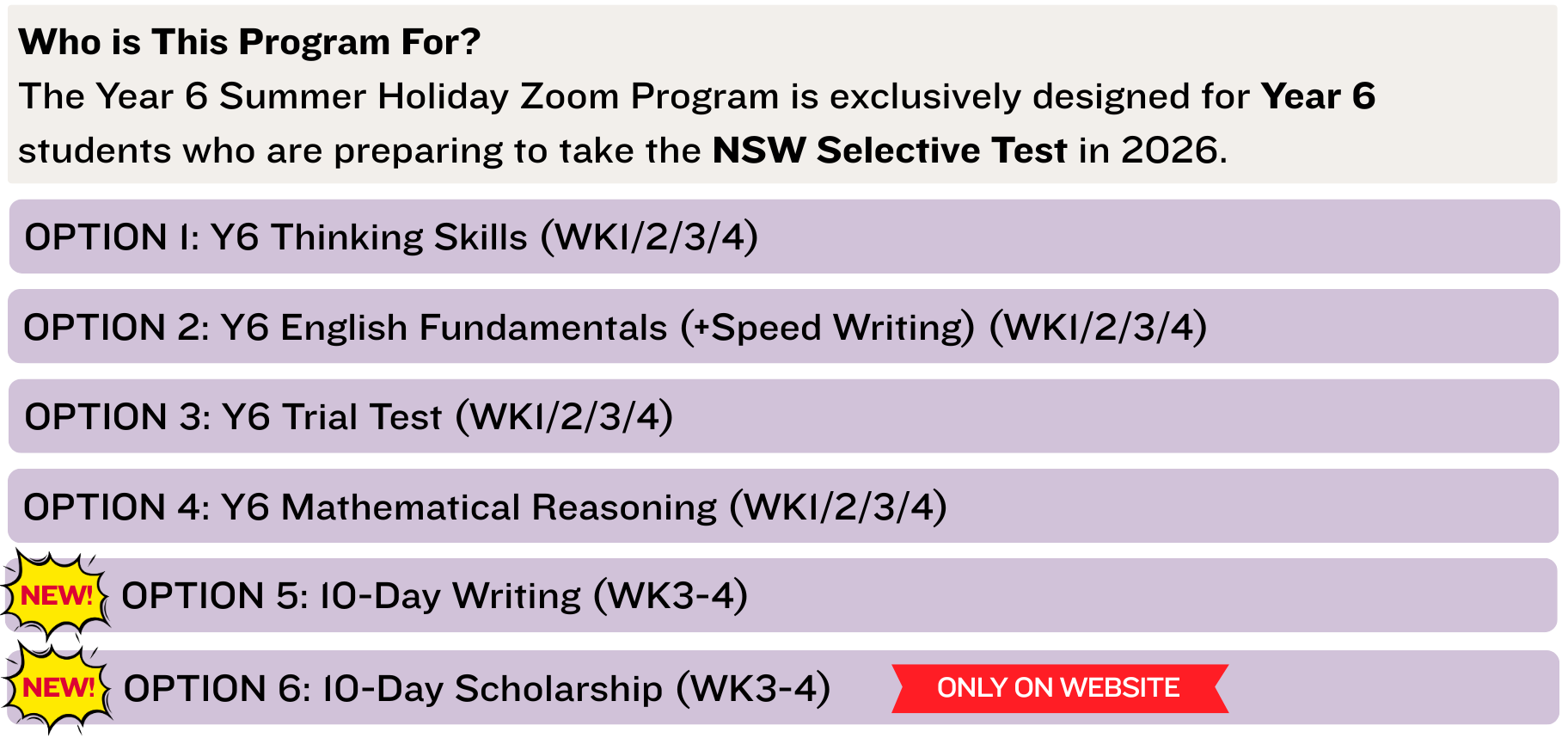 Laser-focused program for students sitting the NSW Selective High School Placement Test and scholarship exams in 2026.